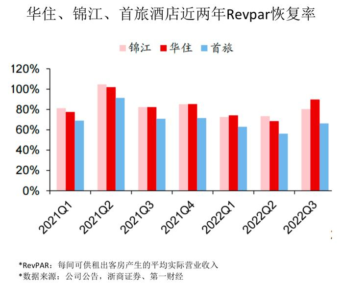 对比三大龙头22Q3经营数据,华住整体恢复速度要快于锦江和首旅,其2022年第三季度的Rev PAR已恢复至2019年水平的90%,锦江酒店中国境内整体平均Rev PAR为2019年同期的80.40%,首旅如家全部酒店Rev PAR为2019年同期的66.5%。