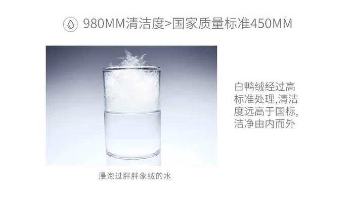 除此外,鸭绒还要经过120℃高温的灭菌、除味处理,清洁度达到了980mm(国家标准450MM),每一朵羽绒都光洁干净、没有异味。