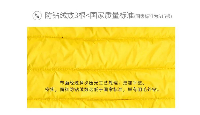 布面经过多次压光工艺处理,更加平整、密实,防钻绒数3根,也远小于国家质量标准(国家标准为S15根),很少有羽毛外钻。