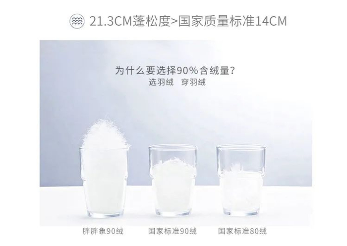 有21.3cm的蓬松度,远高于国家质量标准(国家标准为14cm)在保证轻盈的同时,也兼具保暖性。