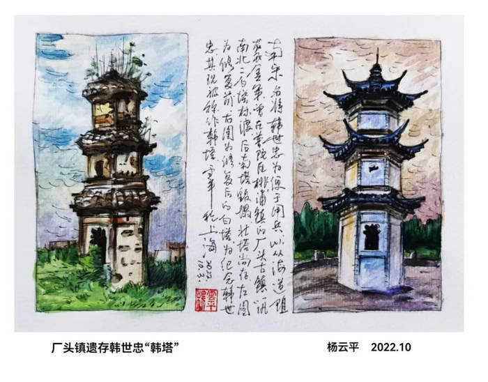 村民们的热情回应,让杨云平感受到了上海人对当地文化的重视。这也促使杨云平花费更多时间和经历,为更多古镇作画。随着画作越画越多,杨云平对古镇的了解就越多。江南一带的古镇,都是从集市贸易开始的,有一些最早是驻军的地方,后来人就慢慢聚拢,形成了镇。比如很多人都没听过的普陀区厂头镇,就建于南宋抗金名将韩世忠在此驻兵时。至今,韩世忠为阻袭金兵所建的塔还在那里。