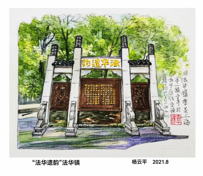“上世纪 50 年代这一片其实很繁华,饭店、混堂(即澡堂)、南货店等生意也都兴隆,我还常陪爸爸在小酒馆里喝五加皮吃花生米。”杨云平回忆,现法华镇只剩了法华镇路路名以及上海交通大学法华校区内的两棵老银杏树。为怀念古镇,杨云平画了“法华遗韵”牌坊聊以自慰。