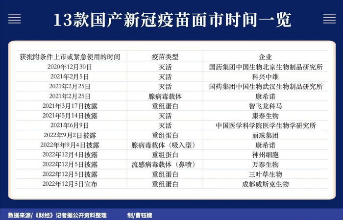 至今,中国已13款新冠疫苗获批附条件上市或获准紧急使用。这13款疫苗的获批时间,大致分布在两个区间:第一波在2021年7月之前,共七款;第二波在2022年9月以后,至今共六款。