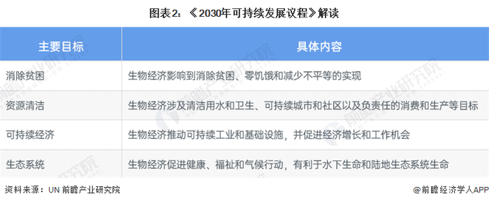 联合国一直以来都致力于发展全球绿色可持续性产业,生物经济的发展模式和产业结构将很大程度上帮助环保、可持续事业的建设,2015年联合国通过了《2030年可持续发展议程》,该行动计划涵盖了17个可持续发展目标(SDG),其中关于生物经济的主要可以分为四个领域:
