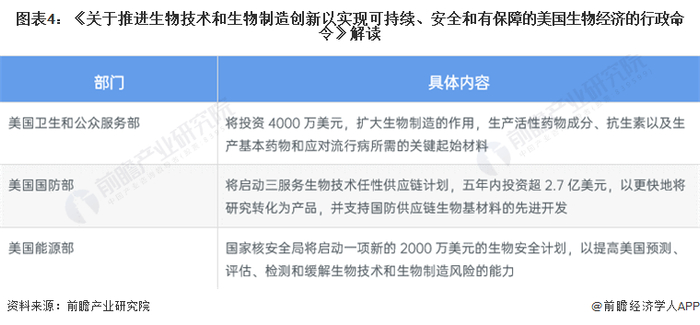 从奥巴马政府执政时期,美国就出台了《国家生物经济蓝图》大力发展生物经济产业,拜登政府于2022年9月签署《关于推进生物技术和生物制造创新以实现可持续、安全和有保障的美国生物经济的行政命令》,启动20亿美元的“国家生物经济与生物制造计划”,其中对卫生和公众服务部、国防部和能源部的主要工作做出了明确指示: