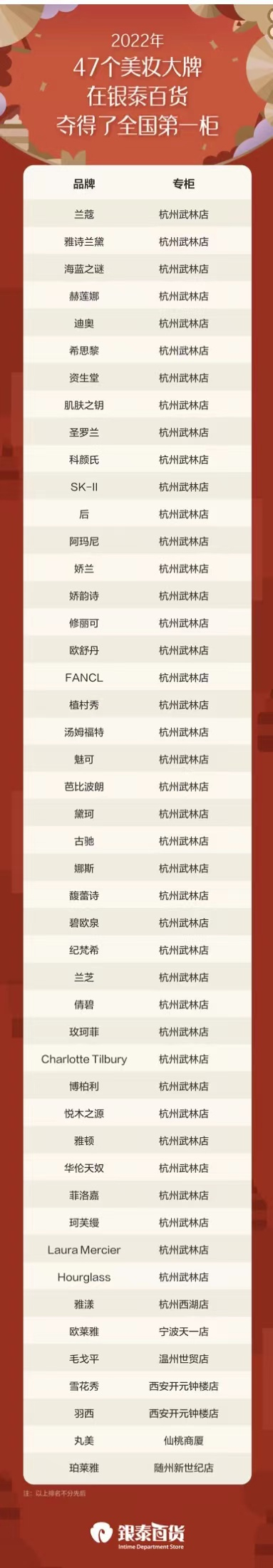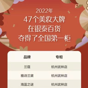 2022年,47个美妆大牌专柜在银泰百货夺得全国销售第一