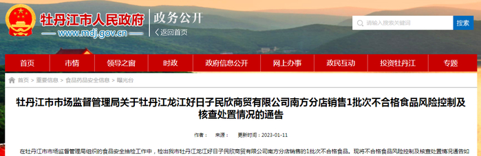 牡丹江市市场监督管理局关于牡丹江龙江好日子民欣商贸有限公司南方分店销售1批次不合格食品风险控制及核查处置情况的通告