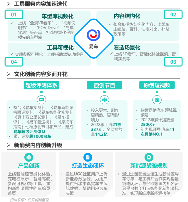 报告在分析易车取得领先优势时认为,易车将内容作为平台发展的根本,根据用户需求和市场变化,加速推进车型库等工具内容迭代,满足用户看选买需求;深化“内容视频化战略”,主攻中长时长原创视频,吸引和培养忠实用户,并以短视频作为重要引流手段;同时加强新能源内容生态创新升级,全面提升用户新能源汽车看选买体验。