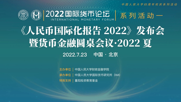 7月23日,由中国人民大学财政金融学院主办、中国人民大学国际货币研究所(IMI)承办、重阳投资教育基金特别支持的“《人民币国际化报告2022》发布会暨货币金融圆桌会议·2022夏”在线上成功举行。本次会议是“2022国际货币论坛”系列活动之一,会上发布了《人民币国际化报告2022:低碳发展的机遇与挑战》。来自国内金融管理部门、科研院所和金融实业界的专家学者围绕“低碳发展的机遇与挑战”这一主题发表了精彩观点。