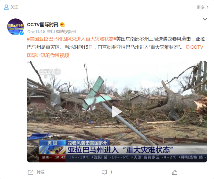 据CCTV国际时讯1月16日消息,美国东南部多州上周遭遇龙卷风袭击,亚拉巴马州是重灾区。当地时间15日,白宫批准亚拉巴马州进入“重大灾难状态”。