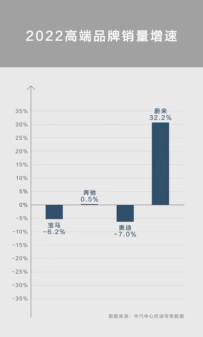 从2022年国内整体车市表现来看,高端市场销量同比微增,但各品牌增速发生了变化。其中,2022年蔚来全年销量累计同比上涨超30%。