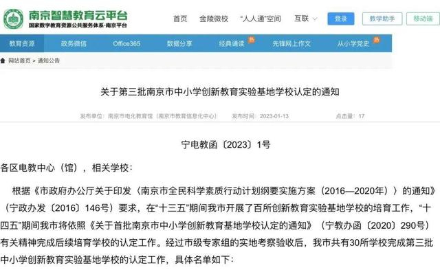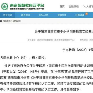近日,南京市电教馆发布《关于第三批南京市中小学创新教育实验基地学校认定的通知》。