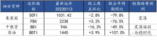 油轮运价:本周BDTI企稳回升,周五录得1445,环比上涨3.9%。周四VLCC-TCE录得13763美元/天,环比大幅下跌40%;Suezmax-TCE环比上涨31%至81541美元/天;Aframax-TCE环比上涨12%至68234美元/天。市场询盘活动不佳,船只运力供给增加,叠加中国疫情放开后原油现实需求恢复缓慢,春节工人放假也放缓了炼厂采购步伐需求,短期内VLCC运费大幅滑落。而船东坚挺中小型船运价下探空间,市场信心略微回升使得中小型船运费先于VLCC触底反弹。短期来看,在整体市场回暖下VLCC有望企稳回升。春节过后关注中国第二波疫情感染程度和2月1日OPEC产油会议。