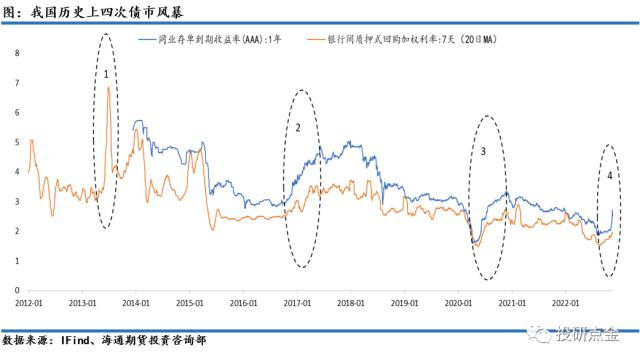 当前的债市冲击是历史上第四次“债市风暴”:其背景是2021年8月份之后我国宏观经济进入下行周期,2022年美联储史上最激进的加息,叠加国内疫情和房地产危机使得这次宏观下行周期格外惨烈。从2021年底开始政策面稳增长措施不断加码,货币政策宽松也一再加码,银行间利率打至创纪录的历史低位,悲观的预期使得宽松出来的资金在金融体系内空转无法进入实体经济。2022年11月公布的美国10月CPI数据超预期下行,使国内宏观面外部压力减轻。与此同时11月11日公布的“优化疫情防控措施20条”和“支持房地产市场平衡健康发展16条”两项政策使市场对经济增长的预期好转。而从10月开始市场预期的央行降准一再落空,央行已经在边际上不再宽松。11月中旬开始债收益率全面飚升,理财产品净值回落使得赎回、债券抛售形成循环,出现了历史上第四次债市风波。