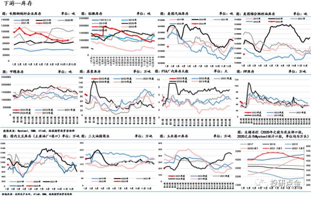 中下游库存方面,化工产业链多数累库,处在同期偏高位置,聚酯链PTA、乙二醇库存均环比增加,处在同期偏高水平;聚烯烃PE、PP库存均环比下降;PVC市场到货有所增加,华东及华南库存增加,本周华东及华南社库较上周增加1.77万吨至25.73万吨,依然明显高于去年同期水平。农产品方面,进口大豆库存环比回落,一季度大豆到港量季节性回落,料库存压力有所缓解;三大油脂总库存继续累积,棕榈油库存累至同期高位,料短期累库趋势仍将持续;玉米港口库存回升,处在同期中性位置,11月生猪存栏回升至同期最高位置,能繁母猪存栏略低于去年同期。