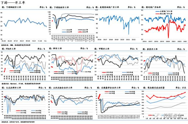 中下游需求端,化工产业链开工率表现分化,聚酯链PTA、乙二醇开工率环比下降,PX开工率提升,处在季节性偏低水平;聚烯烃PE、PP开工率增加;甲醇开工率较前一周下降,外采MTO开工率环比上升13.6%;PVC生产装置平稳,短期新增检修不多,前期停车装置陆续开工,PVC行业开工率较上周提升2.03%至76.50%,周产量增加1.20万吨至33.42万吨,后续一月暂无检修计划,预计PVC开工率延续回升态势。农产品大豆压榨方面,四季度后半段进口大豆到港量增加,料近期油厂开机率维持同期偏高位置;玉米淀粉企业开工率小幅回落,处在同期偏低位置;生猪屠宰开工率小幅回升。