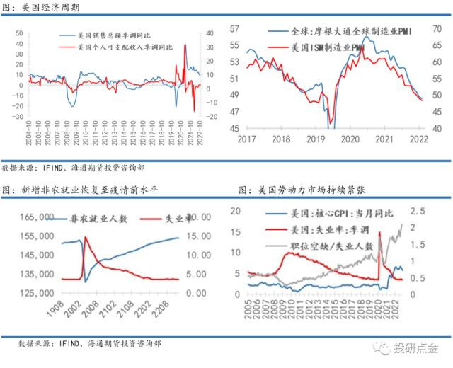 全球主要经济体的周期转换均受制于美联储的货币政策,即美国的经济基本面是全球大类资产的决定性因素。而当前美国经济基本面的特征是高通胀率、低失业率,通胀增速回落速度远远落后于经济增速回落程度,通胀形势仍是联储货币政策的锚。随着通胀在年中见顶回落,并且核心通胀在四季度也开始拐头向下,市场对于货币政策的关注度将会慢慢转移至美国经济本身。紧缩炒作将逐步转移至衰退炒作,市场将更加关注经济数据的演变。