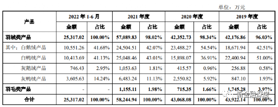 分产品种类来看,古麒绒材的主营业务收入主要依靠白鹅绒产品、白鸭绒产品、灰鸭绒产品的销售,这三类产品在2019年至2022年上半年期间的销售金额分别为4.192亿元、4.194亿元、5.6亿元和2.46亿元,占主营业务收入的比例分别为95.44%、97.37%、96.21%、97.05%。