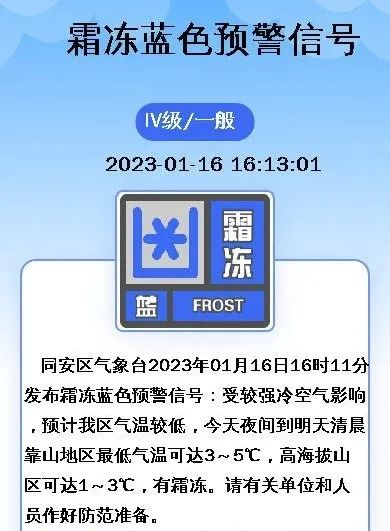 霜冻蓝色预警信号
