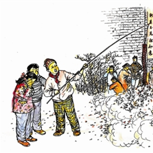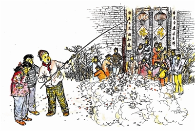 这个顺口溜儿,描述了除夕夜到来之前的吉庆场景,还道出了旧时百姓人家的家务分工。中国的民俗向来是男主外,女主内。包饺子端盖帘儿自然是女人的事;而糊窗户寓意保护家庭安宁,吊钱儿寓意要把钱挣回家来,这当然是男人的事。“满街跑小孩儿,鞭炮窜房檐儿。”说的是孩子们兴高采烈地在街上燃放鞭炮的场景。