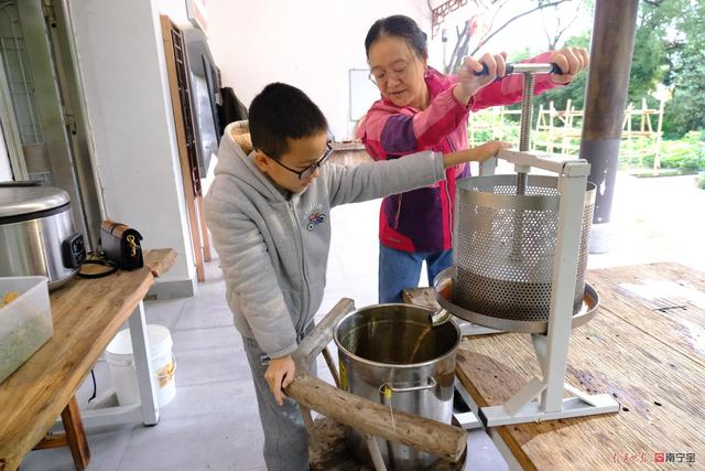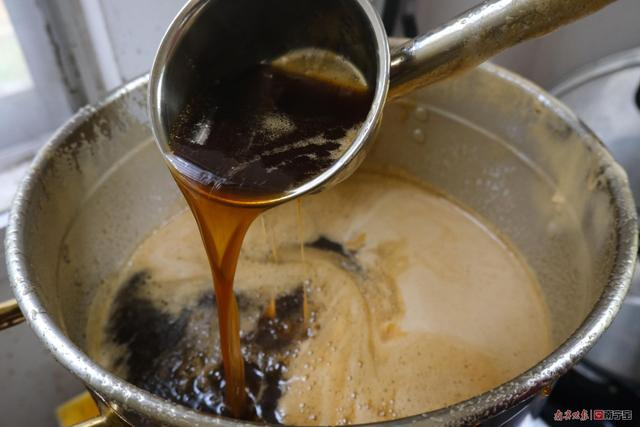 而一旁早已煮好的9斤糯米饭温度正恰到好处。记者把麦芽一把把放入锅中与糯米饭拌均匀。拌好一锅糯米饭和麦芽后,鄢小刚把它拿进房中进行发酵。随后端出另一锅前一天发酵好的黑米麦芽,把它们全部倒入压榨机,示范一遍后就让记者把一锅黑米麦芽全部压榨出糖水。