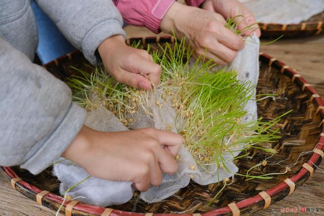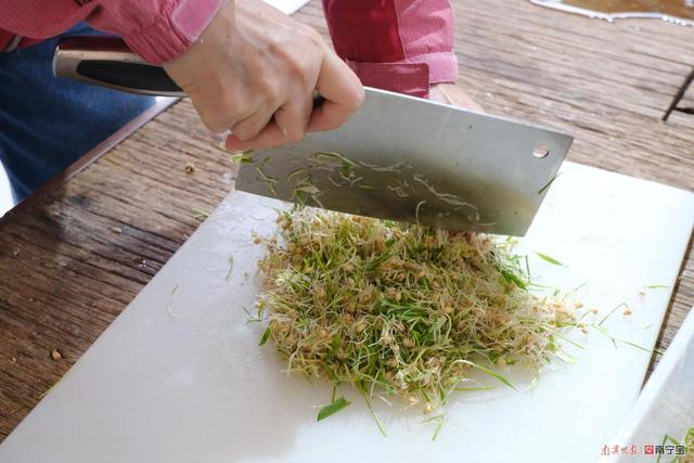 说话间,记者与前来参与研学的小学生宋羽之已经把簸箕的麦芽扯下来,记者把麦芽放到菜板上横切、竖切、剁了三次后,放到一个大簸箕中。