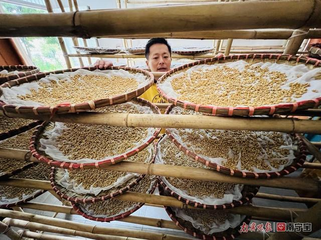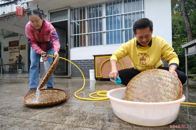 看见记者到来,正在冲洗簸箕的鄢小刚示意记者接过一个个簸箕,甩干水分后,放到一边的竹架上晾着,这些簸箕一会要用来铺放小麦,进行制作麦芽糖的第一步:育种。