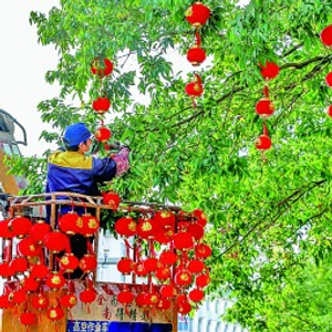 江西赣州全南县市政员工在街道安装灯笼,喜迎新春。李凡钦摄/光明图片