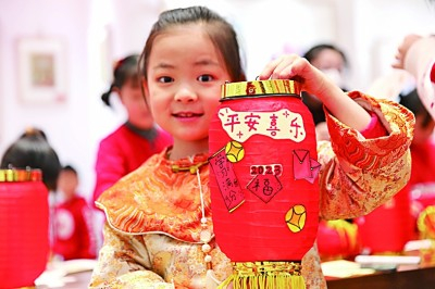 河北承德双桥区的小朋友在展示自己制作的花灯。新华社发