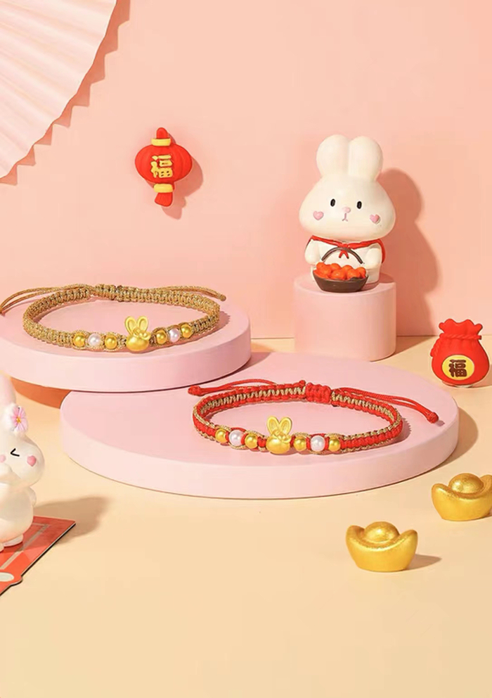 金饰品牌周生生打造了兔闪闪、招财兔、福袋兔、胡萝卜兔、奶萌兔、发发兔、有钱兔等多款兔子形象的Charme系列黄金转运珠,可以进行叠戴与搭配。Charme系列使用无氰硬金电铸工艺,在保证黄金的纯度下,也可以提高硬度及可塑性,可以让串珠不易变形。生肖兔戒指中,“有钱兔”戒指以可爱萌趣的兔子为设计蓝本,打造兔子抱住铜钱的造型,寓意招财进宝,代表新的一年财源滚滚。