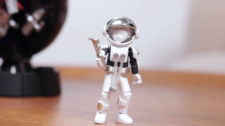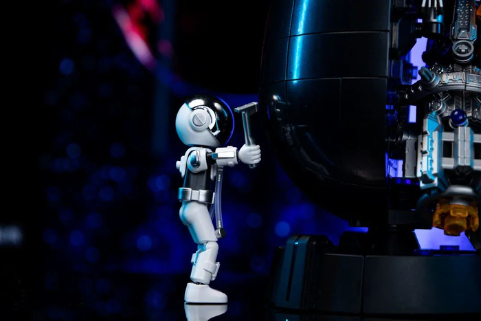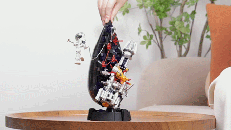 该丁仪积木人手握地质锤,全身11处关节可动,可利用配件悬浮于布鲁可水滴之上。