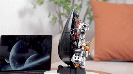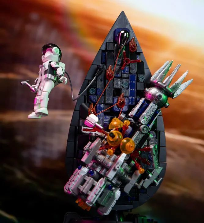 拼之后,积木一面呈水滴状,代表和平的宇宙;另一面则是人类被摧毁的战舰,代表了战争与毁灭。