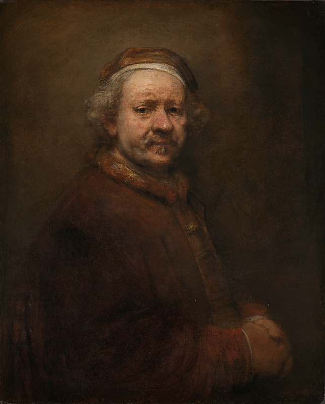 伦勃朗的《63岁的自画像》是他1669年去世前几个月所画的三幅自画像之一。在这幅临终前的自画像中,伦勃朗将关注点聚焦于自己衰老面部的色泽和纹理,用浓厚而又密集的颜料叠加,来呈现他斑驳的皮肤、凹陷的眉毛和嘴唇周围稀疏的毛发。在绘制这张自画像的时候,他正经历着严重的财政危机并已经申请了破产。人们常认为伦勃朗晚年自画像是自我审视的写照,但是它也许是艺术家在不断尝试不同绘画技巧的可能性,用来探索众多与他年龄相仿的赞助人的肖像创作。