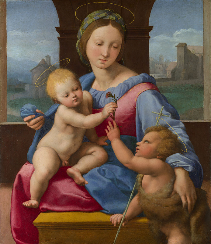 拉斐尔的《圣母子像与施洗者圣约翰》描绘了圣母、婴儿基督和圣约翰。画面中,圣母上身扭转,双腿交叉而坐,姿势复杂。婴儿基督则坐在她的膝上,正低头看着他的表兄施洗者圣约翰,后者手拿一根芦苇十字架。耶稣正在传递一支康乃馨。在宗教画中康乃馨象征着神圣的爱以及基督未来的受难和复活。圣母则似乎陷入了沉思,她试图用蓝色斗篷拢抱基督,另一只手则轻抚摸着身穿皮毛的圣约翰。三位圣像之间的心理互动既复杂又感人。拉斐尔试图通过几何结构图来呈现出绝对和谐的视觉效果,使这些圣像与背景完美地结合在一起,营造出一种深沉的静谧感,同时启发观众在欣赏之中寻找到内心的共鸣与和谐。