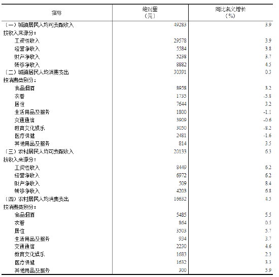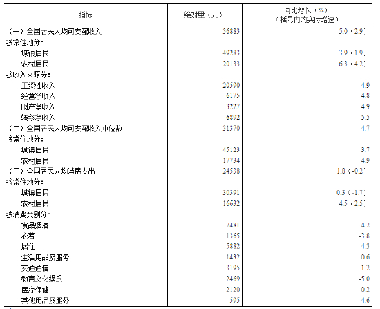 ②居民人均可支配收入名义增速=(报告期居民人均可支配收入/基期居民人均可支配收入-1)*100%;居民人均可支配收入实际增速=(报告期居民人均可支配收入/基期居民人均可支配收入/报告期居民消费价格指数*100-1)*100%。