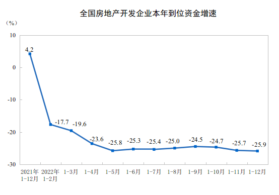 2022年,房地产开发企业到位资金148979亿元,比上年下降25.9%。其中,国内贷款17388亿元,下降25.4%;利用外资78亿元,下降27.4%;自筹资金52940亿元,下降19.1%;定金及预收款49289亿元,下降33.3%;个人按揭贷款23815亿元,下降26.5%。