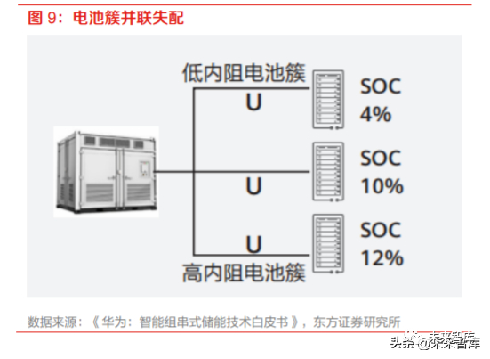 电芯的一致性是影响系统效率的关键因素。电芯的一致性取决于电芯的质量及储能技术方案、电 芯的工作环境。随着电芯循环次数增加,电芯的差异逐步体现,叠加运行过程中实际工作环境的 差异,将导致多个电芯之间的差异加剧,一致性问题突出,对 BMS管理造成挑战,甚至面临安全 风险。电池模组间串联失配:串联的电芯可用容量只能达到最弱电池模组的容量,使得其他电池容量无 法被充分利用。电池簇间并联失配:并联链路上的电池簇可用容量只能达到最弱电池簇的容量,使得其他电池容 量无法被充分利用。电池内阻差异造成环流:电池环流使得电芯温度升高,加速老化,加大系统散热,降低系统效率。在储能电站设计和运行方案中,应当尽量提高电池的一致性以提高系统效率。