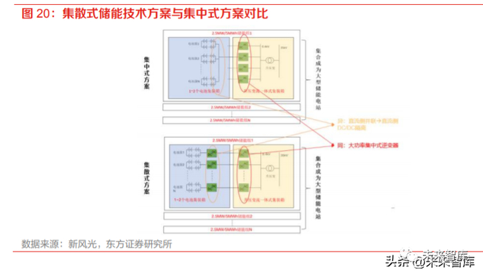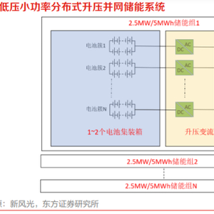 (2)分布式:低压小功率分布式升压并网储能系统,每一簇电池都与一个 PCS 单元链接,PCS 采用小功率、分布式布置。
