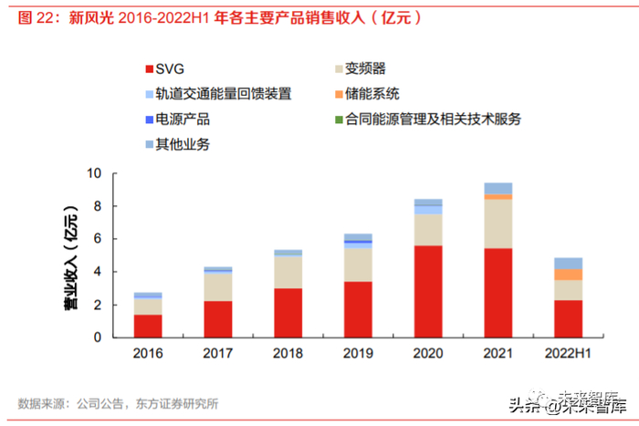 储能是新风光的重要业务板块之一,推出的产品包括低压智慧储能系统(储能变流升压一体机、 三相储能变流器、低压储能变流器、户外储能变流器等)和高压级联储能并网产品。公司储能产 品于 2021 年开始投入市场,2022 年上半年迎来高速增长。2021 年储能系统的收入为 0.3 亿元, 2022 年仅上半年储能产品收入 0.7 亿元,占公司营收 14%。