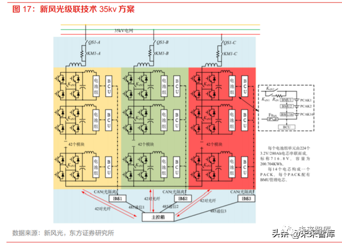高压级联的储能方案通过电力电子设计,实现无需经过变压器即可达到 6-35kv 并网电压。以新风 光35kv解决方案为例,单台储能系统为12.5MW/25MWh系统,系统电气结构与高压SVG类似, 由 A、B、C 三相组成。每相包含 42 个 H 桥功率单元配套 42 个电池簇。三相总共 126 个 H 桥功 率单元共 126 簇电池簇,共存储 25.288MWh 电量。每簇电池包含 224 个电芯串联而成。