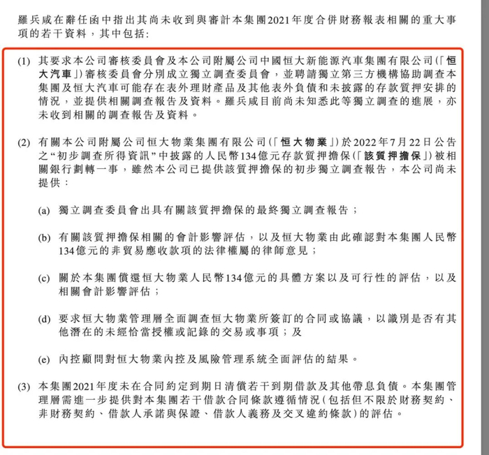 普华永道在中国恒大的辞任函中指出,其未获得若干审计资料,包括以下事项:普华永道要求中国恒大审核委员会及恒大汽车审核委员会分别成立独立调查委员会,并聘请独立第三方机构协助调查中国恒大及恒大汽车可能存在表外理财产品及其他表外负债和未披露的存款质押安排的情况,并提供相关调查报告及资料。普华永道称其目前尚未知悉此等独立调查的进展,亦未收到相关的调查报告及资料。