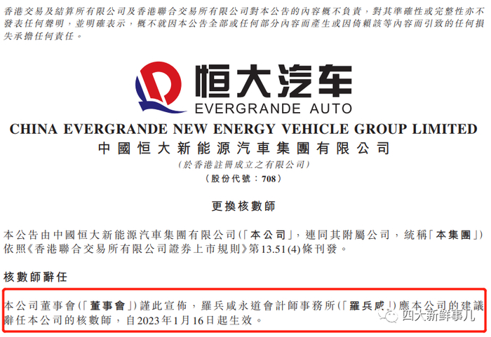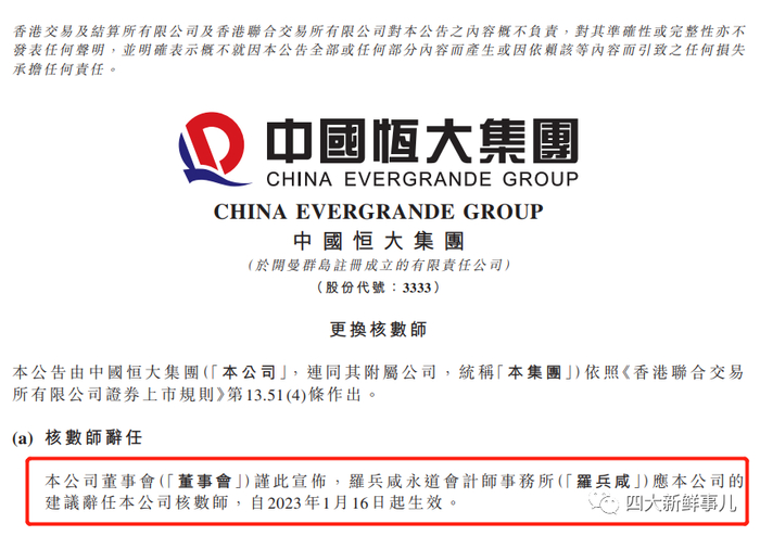 2023年1月16日晚间,中国恒大、恒大物业和恒大汽车均发布更换核数师的公告:罗兵咸永道会计师事务所(即普华永道,香港称普华永道为罗兵咸永道)辞去核数师,自1月16日起生效。同时,恒大系3家上市公司委聘上会栢诚会计事务所为新的核数师(审计机构)。
