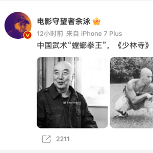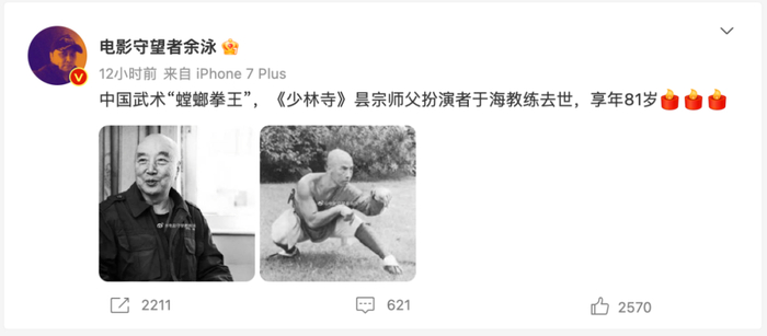 16日晚,南京艺术学院口述历史研究中心特聘研究院余泳发布微博表示,中国武术“螳螂拳王”,《少林寺》昙宗师父扮演者于海教练去世。后经多家媒体证实,于海于1月16日因病去世,享年81岁。