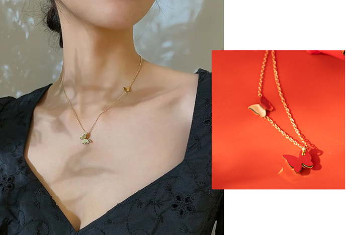 犹如两只蝴蝶在颈间追逐欢舞,灵动浪漫,尽显甜美温柔,搭配小裙子、V领衣服都特别好看。