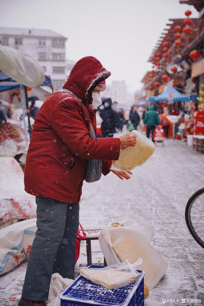 1月14日,淄博博山的大街大集上空飘着鹅毛大雪,大集却依旧热闹。揣手吆喝的商客、手拎货物的市民,还有大集摊位上的八陡精肉丸、博山酥锅、萝卜丸子、各种小吃……岁末年初的家乡大集,不仅是一个购买年货的好去处,更是回忆小城“烟土”味寄托乡情所在。
