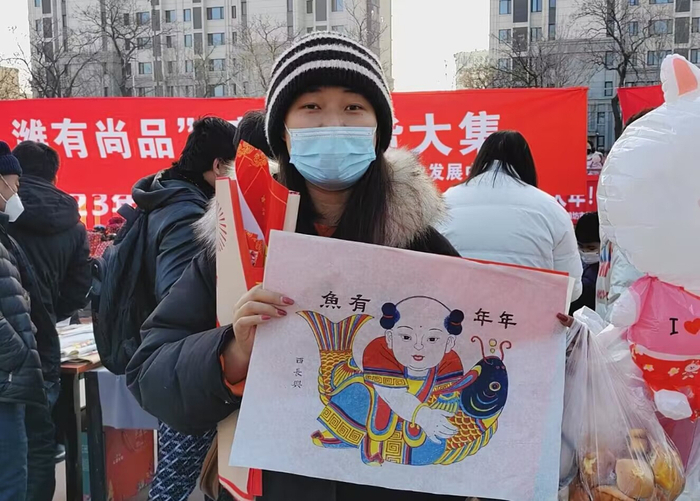 记者带着在黄河大集上免费领到的对联、杨家埠木版年画以及买的许多年货满载而归。