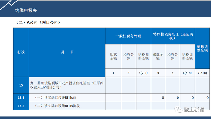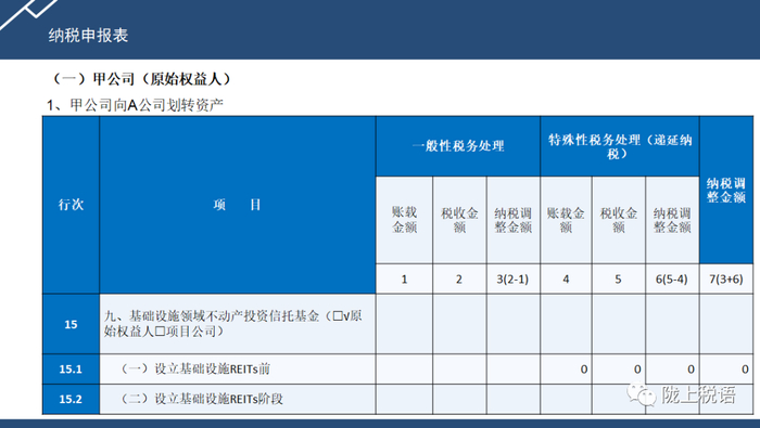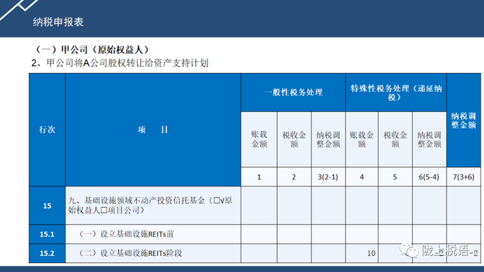 第15.2 行“(二)设立基础设施REITs 阶段”:填报原始权益人在设立基础设施REITs 阶段,针对向基础设施REITs 转让项目公司股权实现的资产转让评估增值以及按照战略配售要求自持的基础设施REITs 份额对应的资产转让评估增值等产生的损益金额及调整金额。