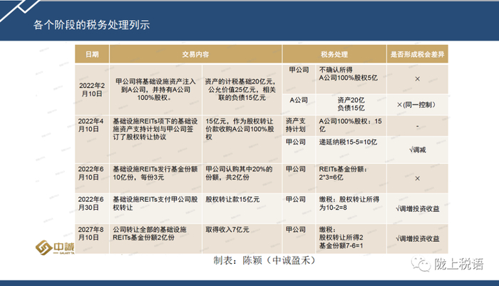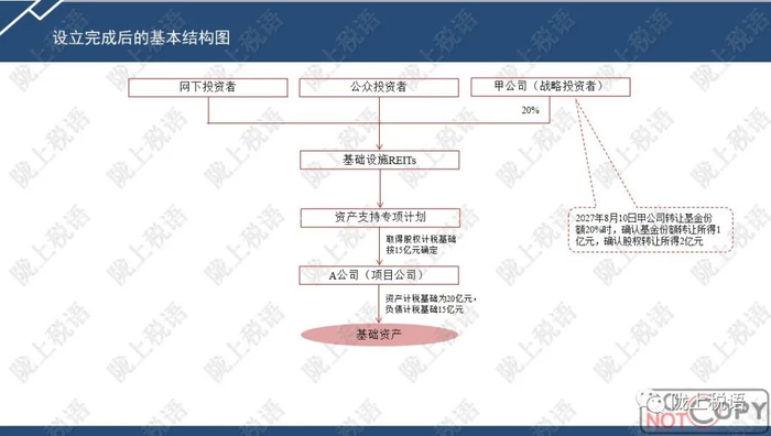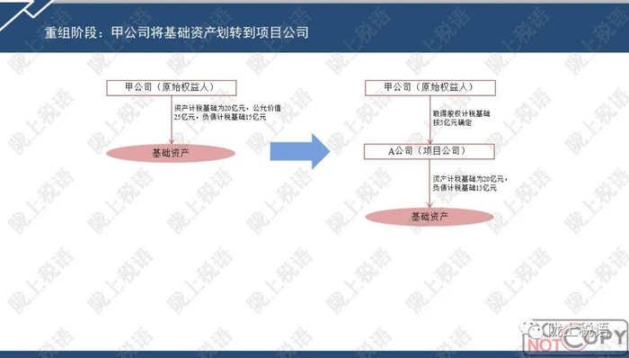 1、在资产注入阶段,甲公司向A公司划转基础设施资产,双方选择特殊性税务处理,按照3号公告,双方均不确认所得。A公司取得基础设施资产的计税基础为20亿元、负债的计税基础为15亿元。甲公司取得A公司100%股权的计税基础为20-15=5(亿元)。