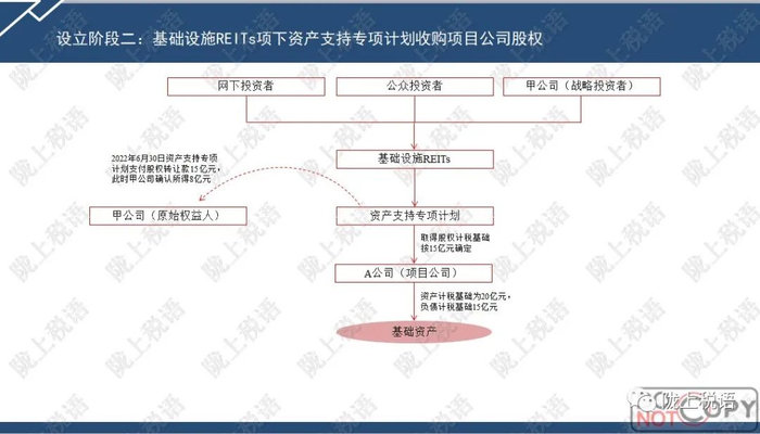 2、在基础设施REITs设立阶段,甲公司的所得,需要分两部分进行处理:甲公司转让A公司100%股权转让所得15-5=10(亿元),可递延至2022年6月30日收到股权转让款时确认。其中,甲公司持有基础设施REITs的20%份额,该部分对应的股权转让所得为10×20%=2(亿元),允许在甲公司转让基金份额再予确认。即2022年6月30日,甲公司应确认的项目公司股权转让所得为10-2=8(亿元)。