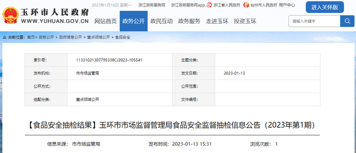 浙江省玉环市市场监管局发布2023年第1期食品安全监督抽检信息